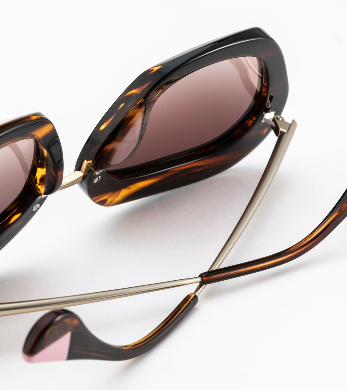 Modello combinato con acetato con volumi. Aste in metallo con terminale in acetato e lenti CR39 di fascia alta con massima protezione UV prodotte da Karl Zeiss.