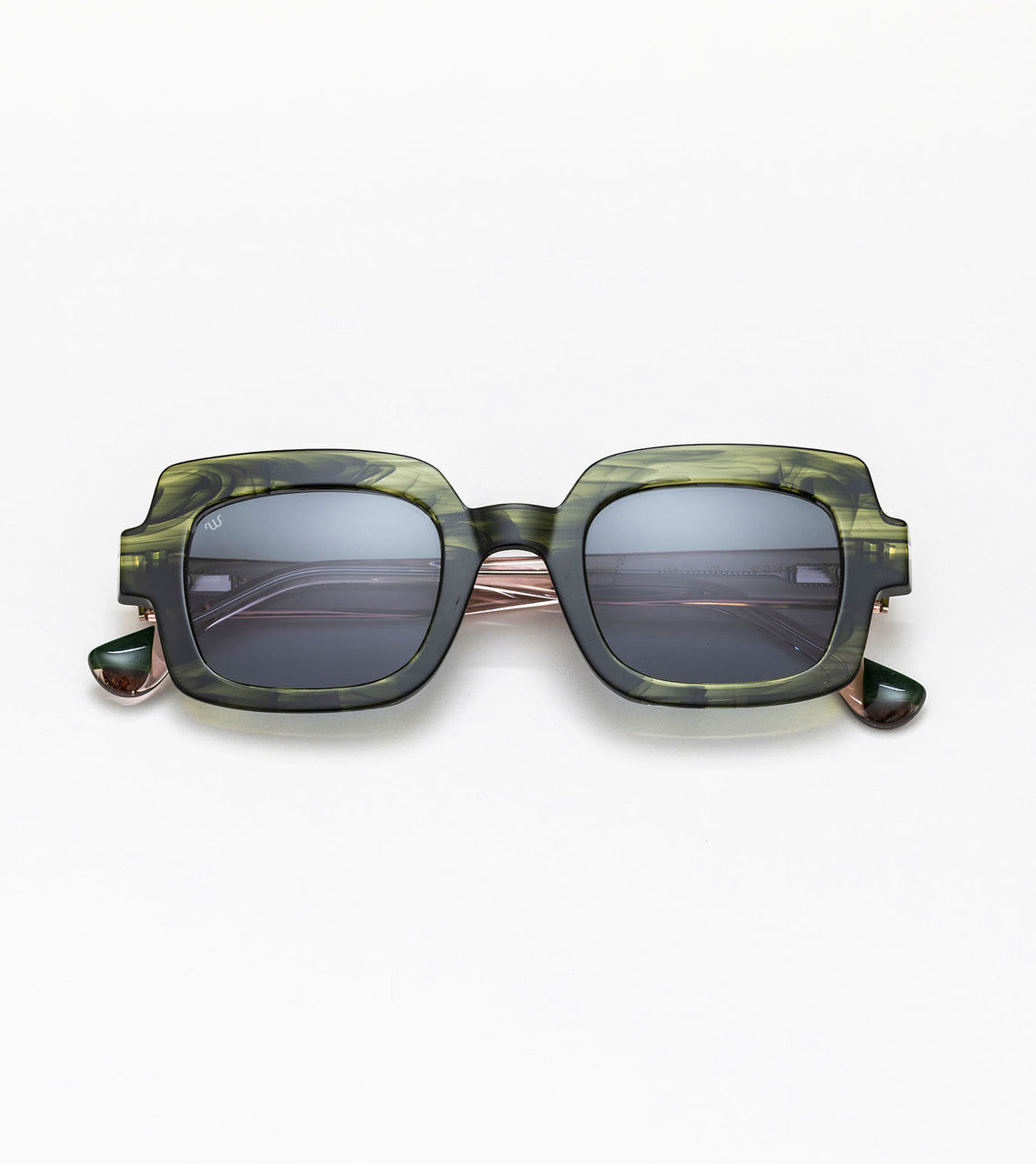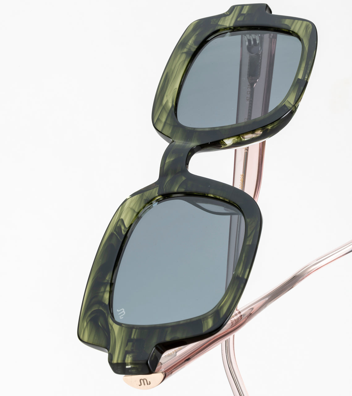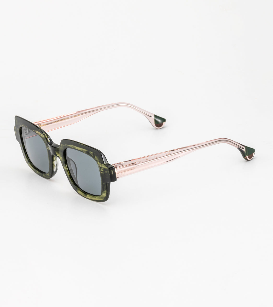 Frontale in acetato italiano con volumi. Cerniera tedesca a 5 assi e lenti CR39 con protezione UVA e UVB prodotte da Karl Zeiss.